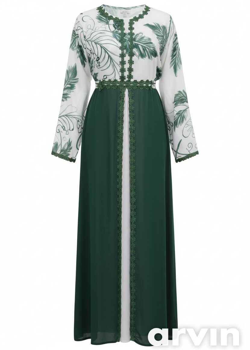 Cette robe féminine se distingue par son design élégant et raffiné, alliant une teinte vert foncé profonde à de délicats motifs feuillagés imprimés sur le haut. Les broderies fines apportent une touche de sophistication, mettant en valeur la silhouette avec harmonie.